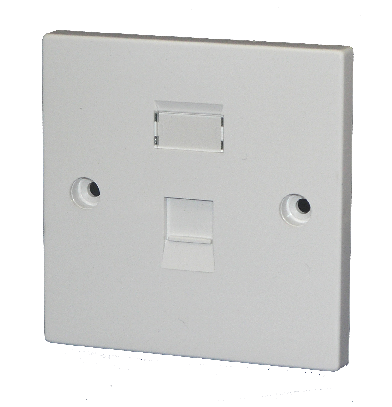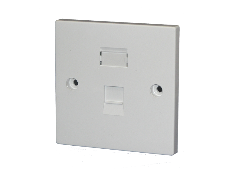 Cat5e/Cat 6 component level socket mounted in a single or double port faceplate and requiring a standard back box for installation. For additional security and improved appearance the sockets are supplied with screw caps to discourage unauthorised tampering. The shuttered front aperture protects against ingress of dust. A ‘slip-in’ labelling field is located above each outlet for port identification.